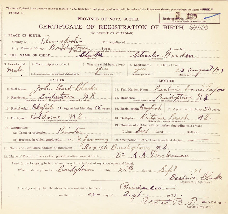 21. Name and Post Office address of Informant Beatrice Clarke Box 46 Bridgetown N.S.