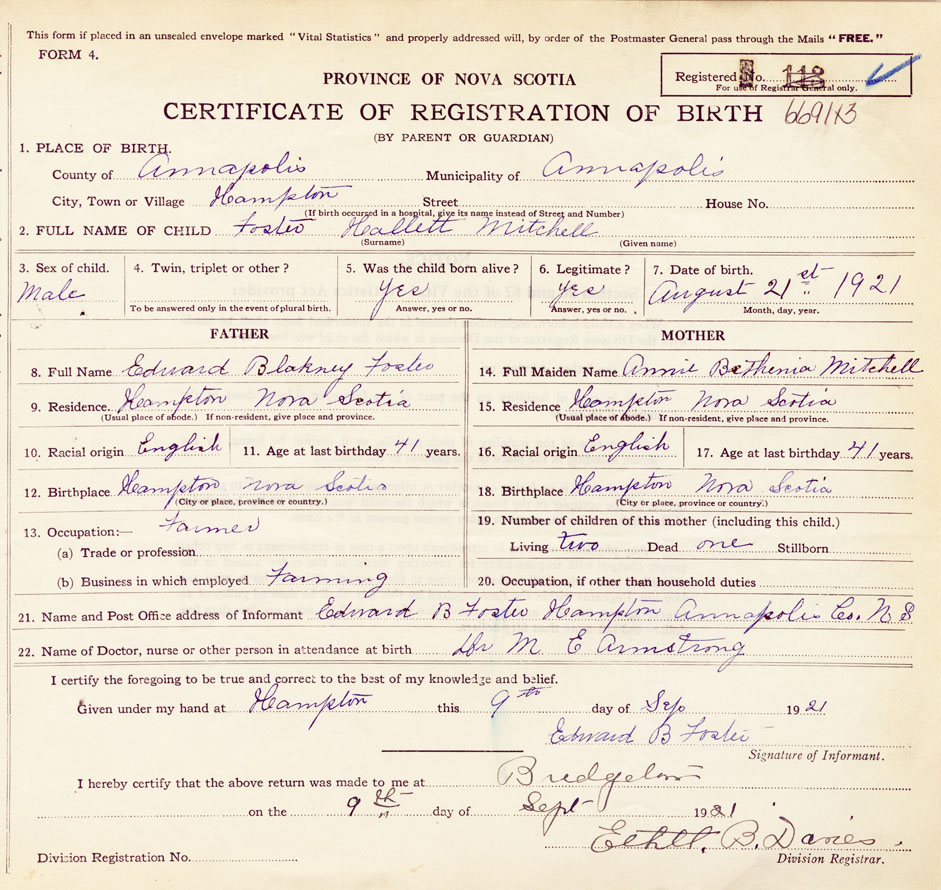 21. Name and Post Office address of Informant Edward B. Foster Hampton, Annapolis N.S.