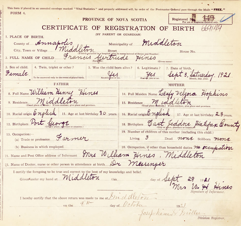 Female Birth Registration: Year: 1921 number: 66900149