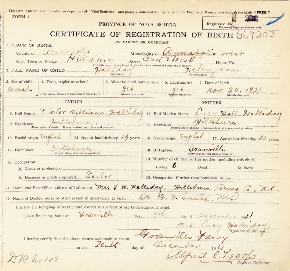 2. FULL NAME OF CHILD Halliday, Helen Jean