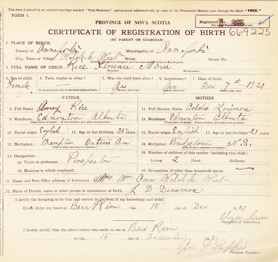 Female Birth Registration: Year: 1921 number: 66900225