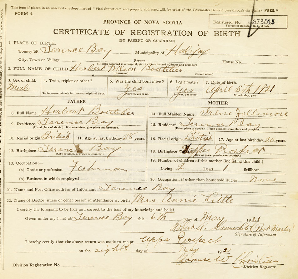 21. Name and Post Office address of Informant Robert A. Slaunwhite (Post Master) Terence Bay