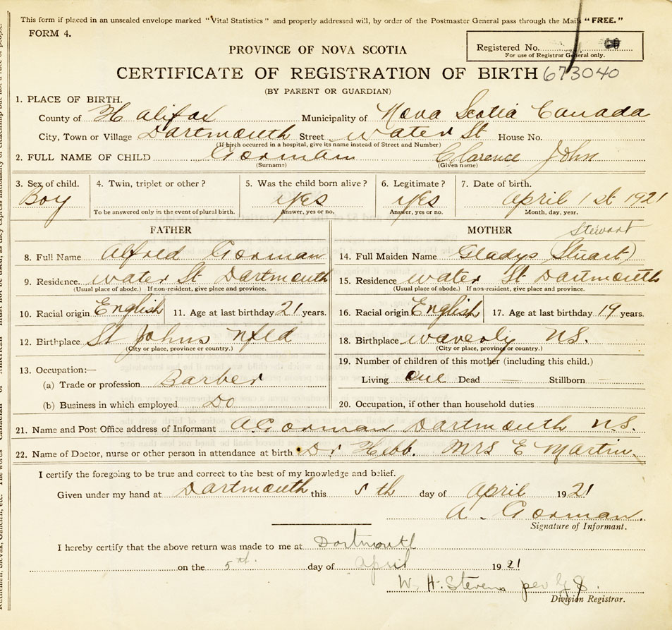 Male Birth Registration: Year: 1921 number: 67300040