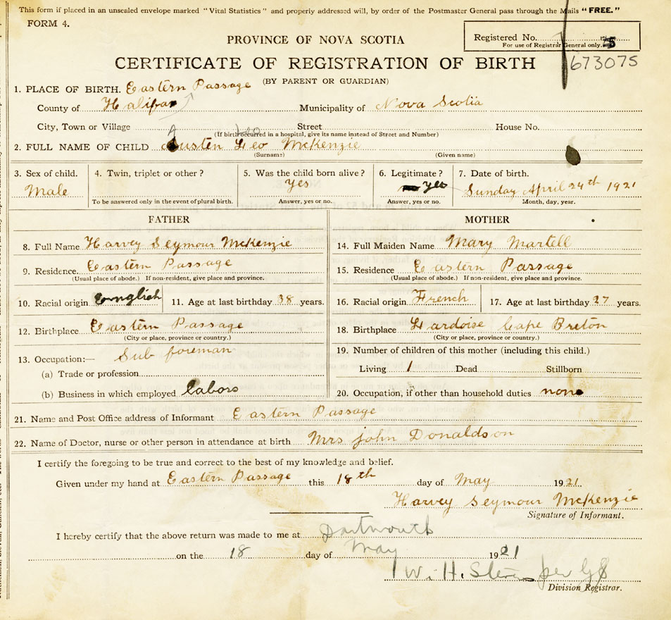 21. Name and Post Office address of Informant Harvey Seymour McKenzie Eastern Passage