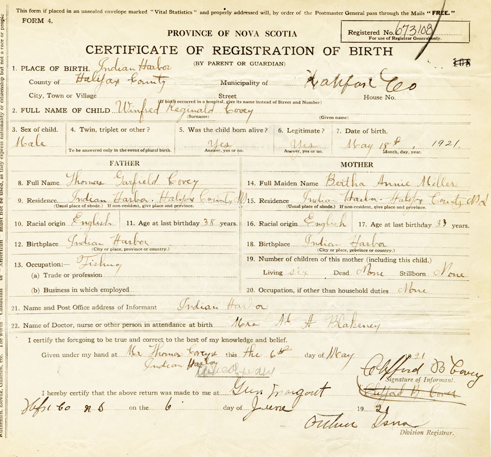 2. FULL NAME OF CHILD Covey, Winfred Reginald