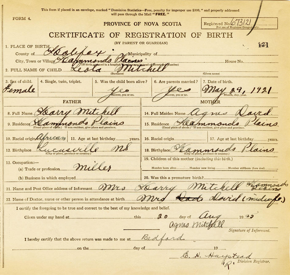 21. Name and Post Office address of Informant Mrs. Harry Mitchell Hammonds Plains