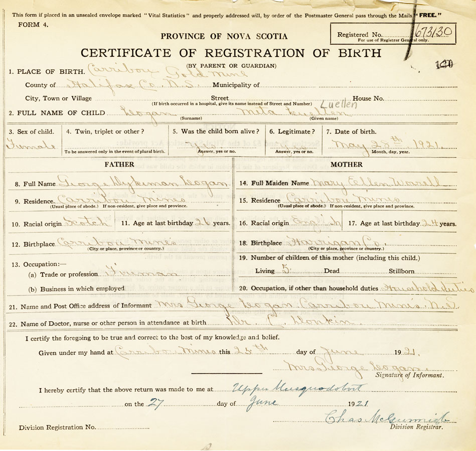 21. Name and Post Office address of Informant Mrs. George Logan Carribou Mines