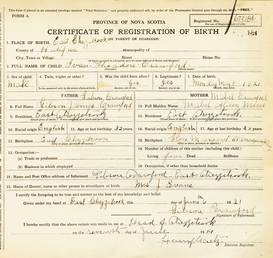 21. Name and Post Office address of Informant Gibson Crawford East Chezzetcook