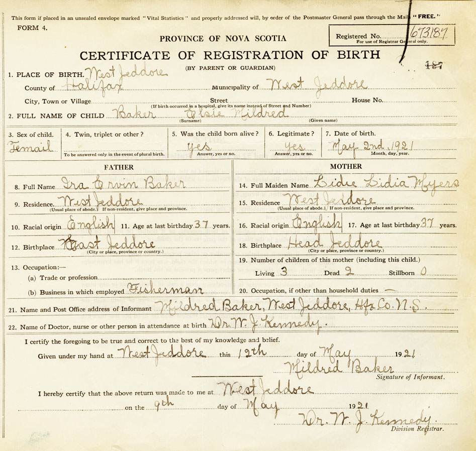 21. Name and Post Office address of Informant Mildred Baker West Jeddore