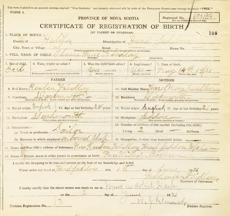 21. Name and Post Office address of Informant Mrs. Reuben Findlay Head of Jeddore