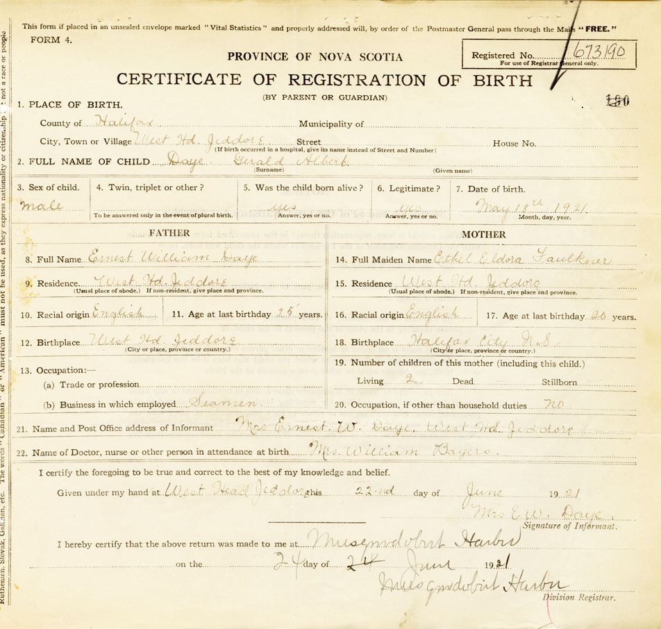 21. Name and Post Office address of Informant Mrs. Ernest W. Day West Head Jeddore
