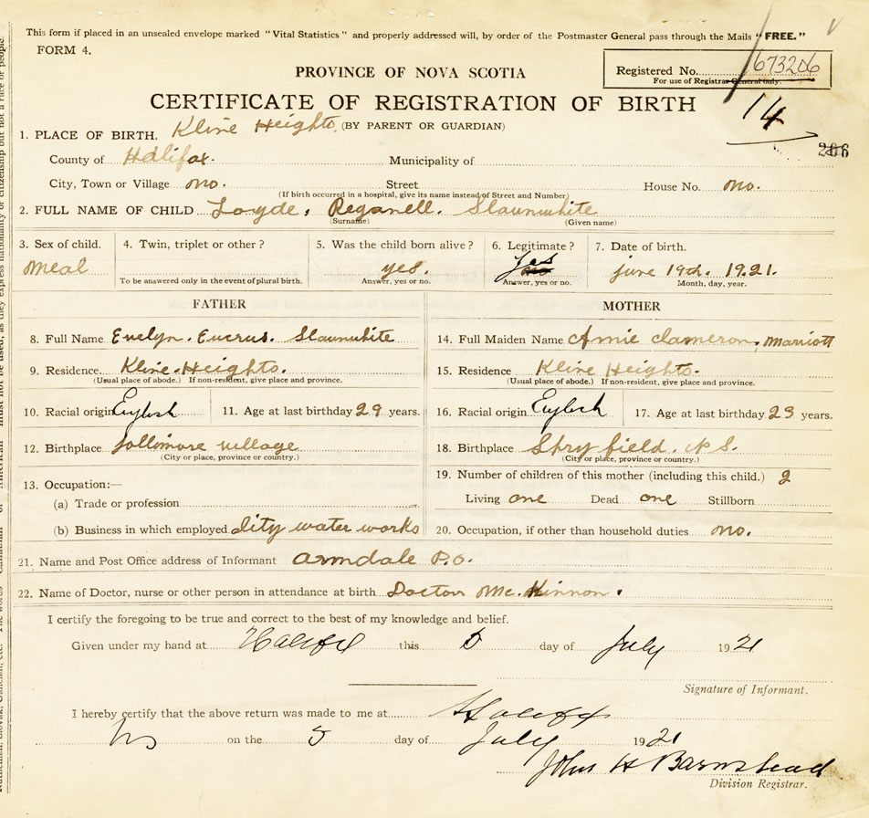 2. FULL NAME OF CHILD Slaunwhite, Lloyd Reginald