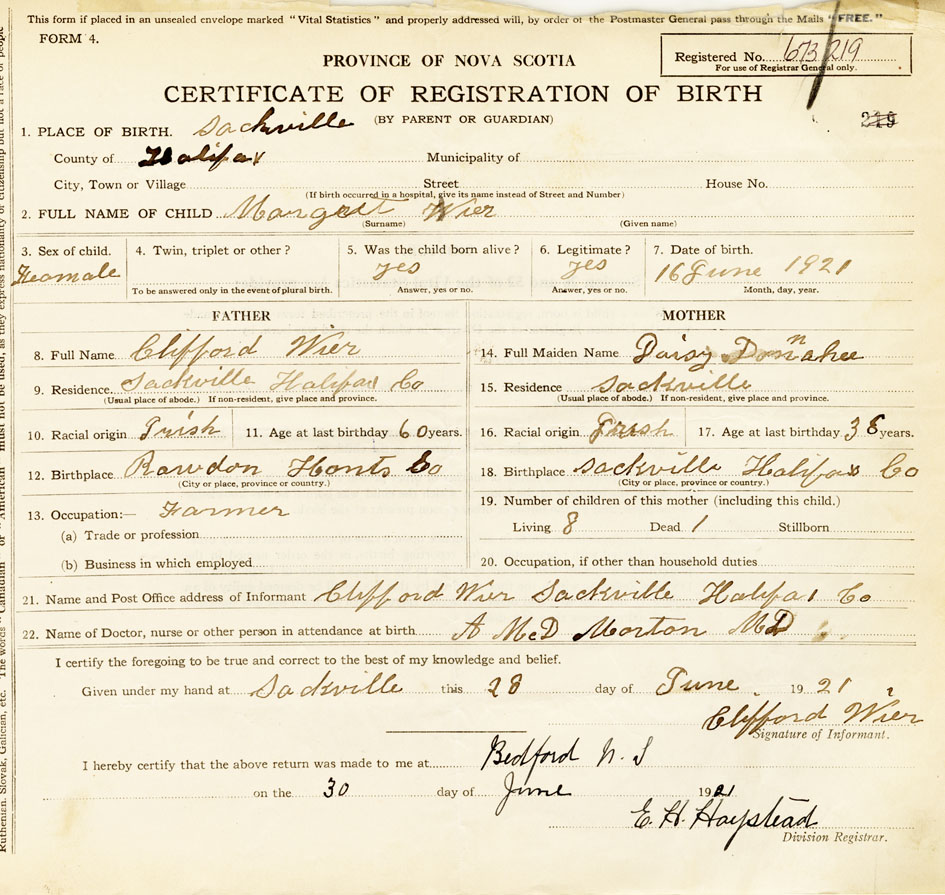 21. Name and Post Office address of Informant Clifford Wier Sackville Halifax Co