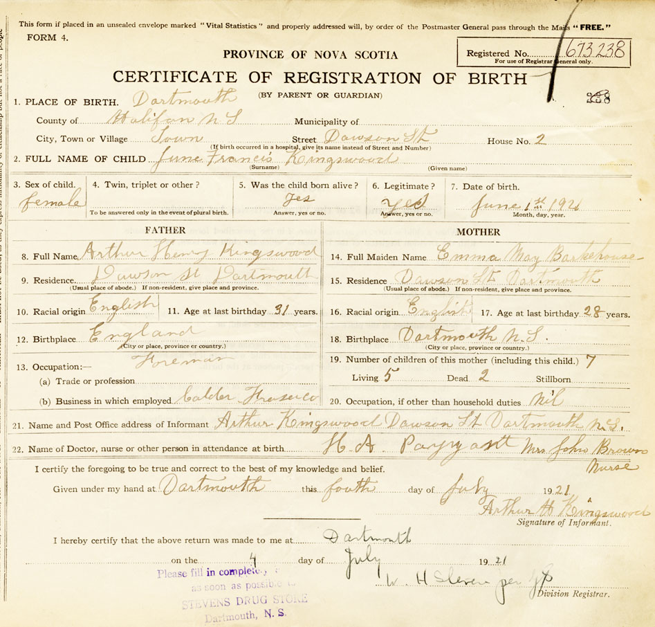 21. Name and Post Office address of Informant Arthur H. Kingswood Dawson St., Dartmouth