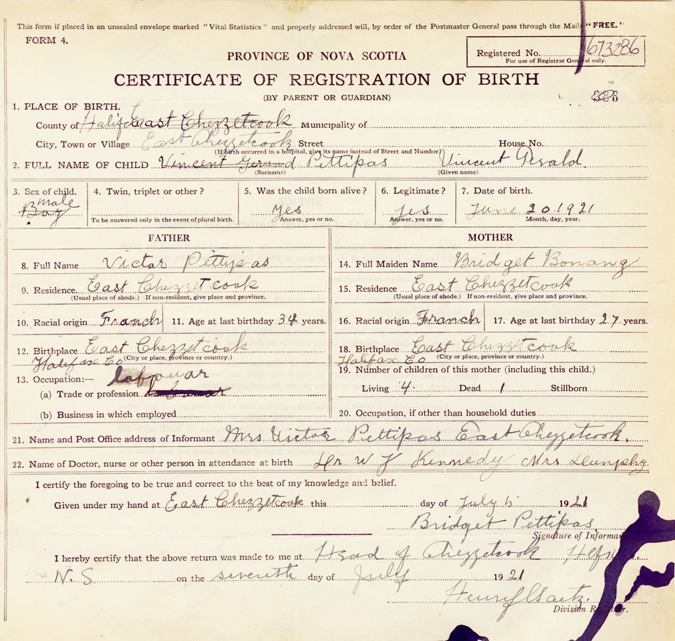 21. Name and Post Office address of Informant Mrs. Victor Pettipas East Chezzetcook