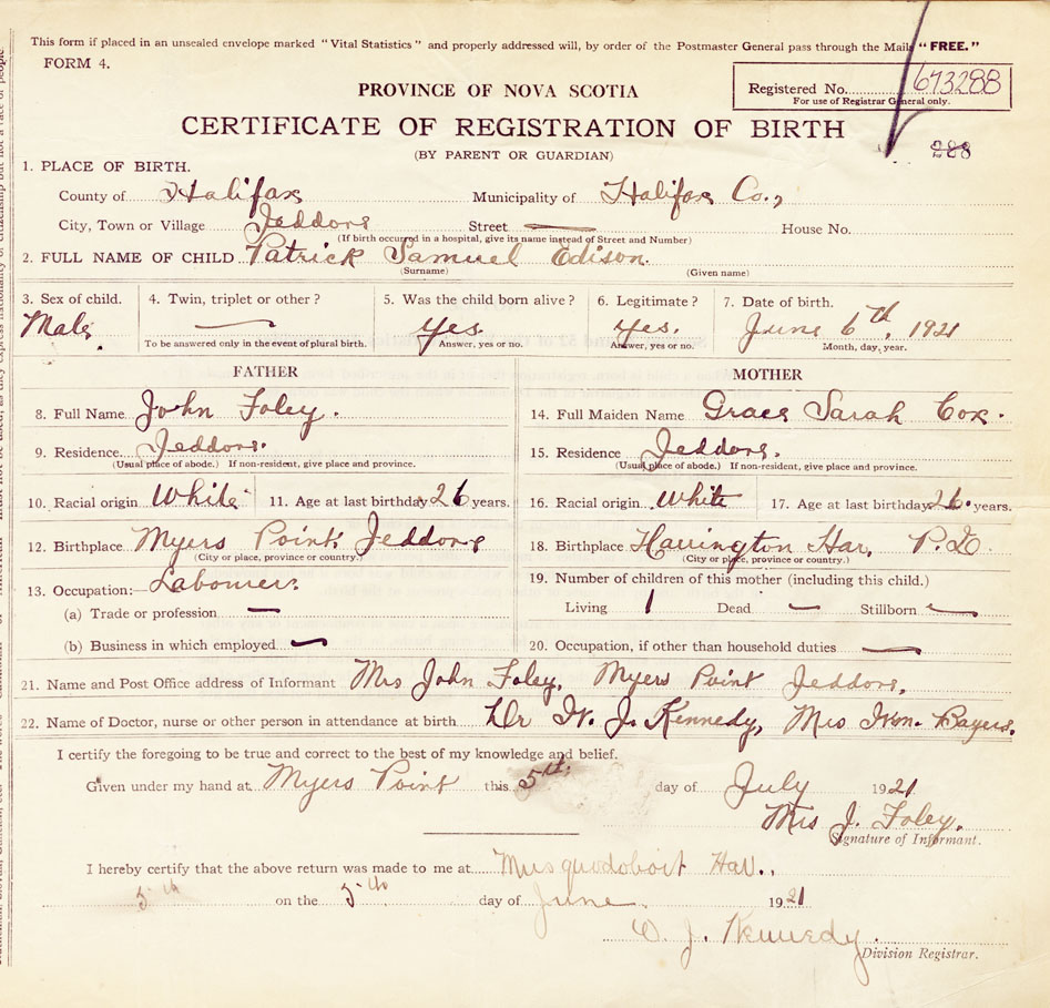21. Name and Post Office address of Informant Mrs. John Foley Myers Point, Jeddore