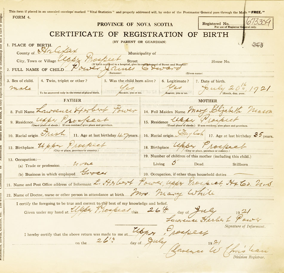 21. Name and Post Office address of Informant L. Herbert Power Upper Prospect, Hfx.