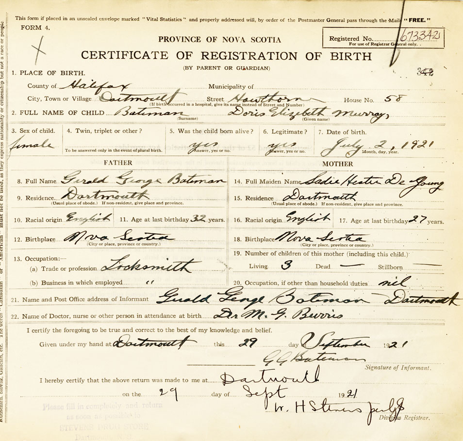 Female Birth Registration: Year: 1921 number: 67300342