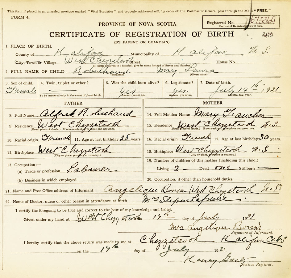21. Name and Post Office address of Informant Angelique Bonin West Chezzetcook N.S.