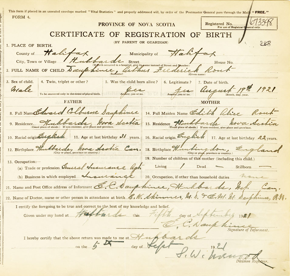 22. Name of Doctor, nurse or other person in attendance at birth B.W. Skinner M.D., E.M.M. Dauphinee (RN)