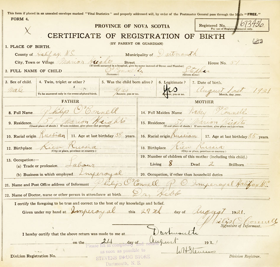 21. Name and Post Office address of Informant Philip O'Connell P. O. Imperoyal, Halifax