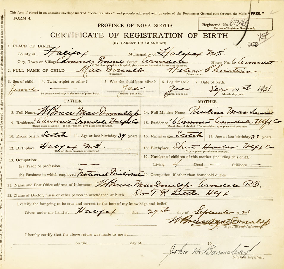 21. Name and Post Office address of Informant W. Bruce MacDonald 6Armdale, Halifax Co., NS