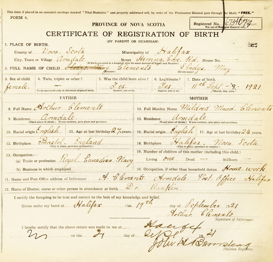 21. Name and Post Office address of Informant Arthur Clements Armdale Post Office Halifax