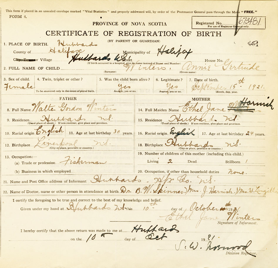 21. Name and Post Office address of Informant Ethel Jane Winters Hubbards, Hfx