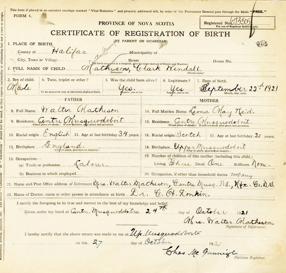 21. Name and Post Office address of Informant Mrs. Walter Matheson Centre Musquodoboit Post Office, Halifax.