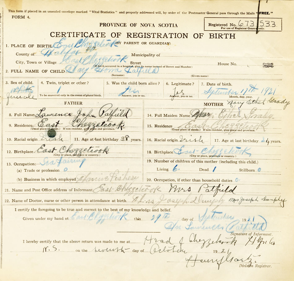 21. Name and Post Office address of Informant Mrs. Patfield East Chezzetcook