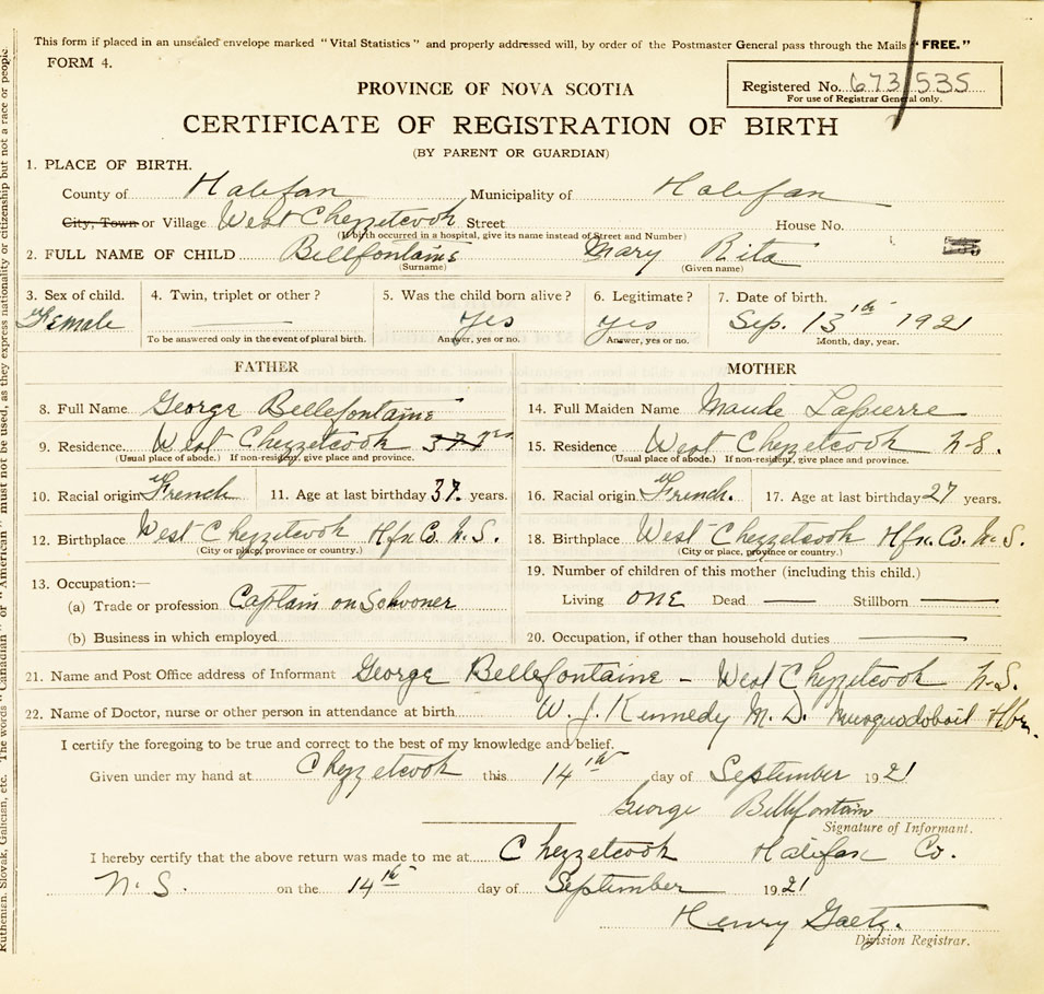 21. Name and Post Office address of Informant George Bellefontaine West Chezzetcook