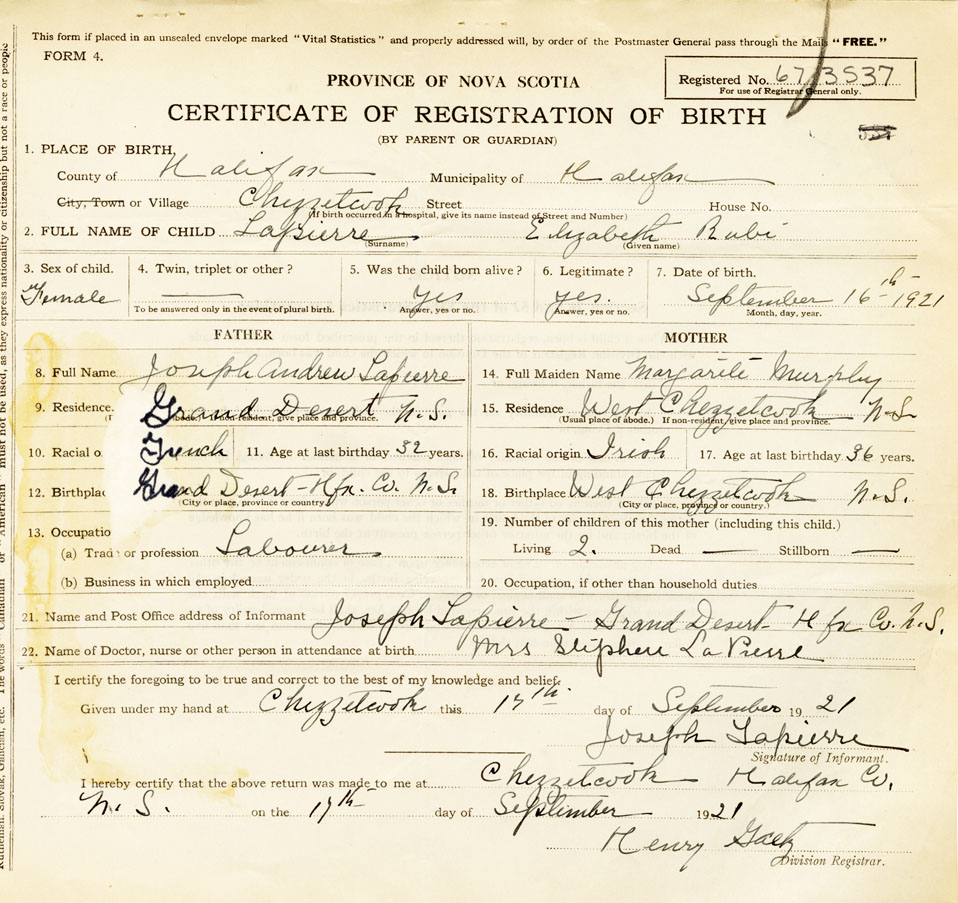21. Name and Post Office address of Informant Joseph Lapierre Grand Desert, Hfx.