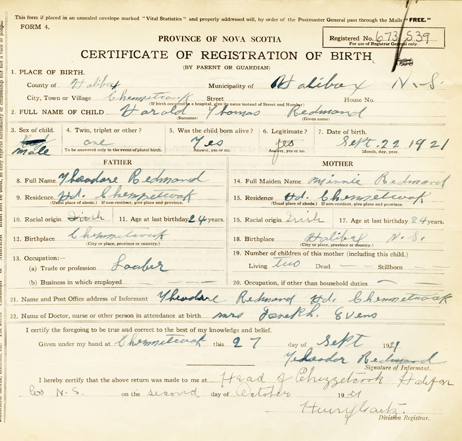 21. Name and Post Office address of Informant Theodore Redmond Head of Chezzetcook