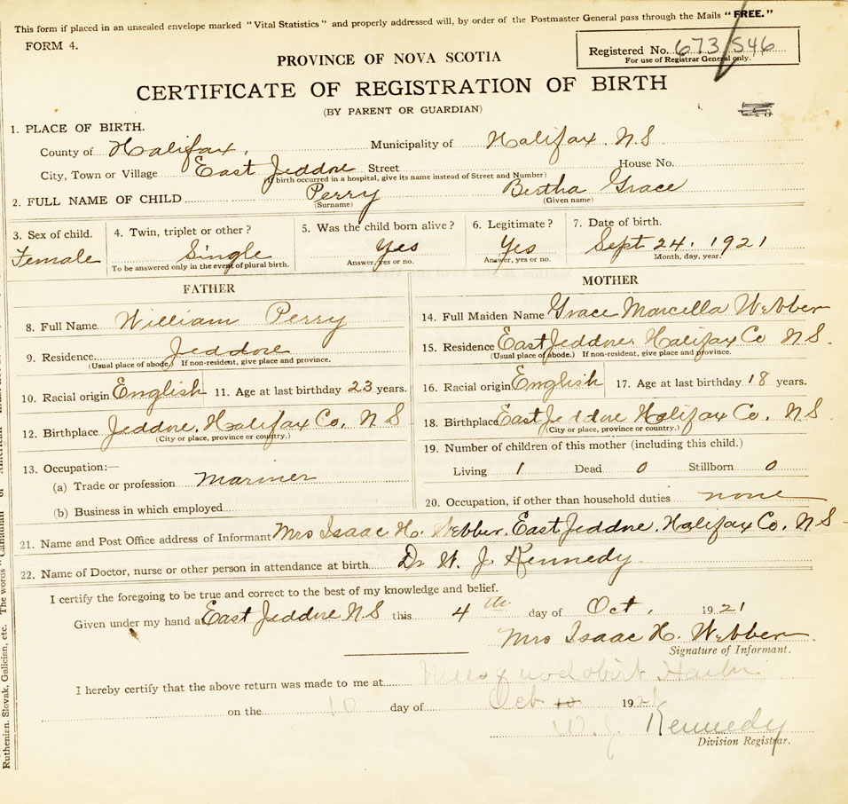 21. Name and Post Office address of Informant Mrs Isaac H. Webber East Jeddore, Halifax N. S.