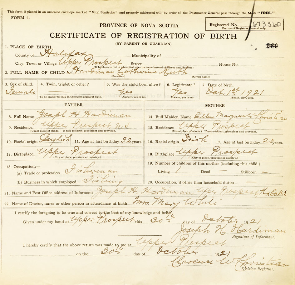 21. Name and Post Office address of Informant Joseph H. Hardiman Upper Prospect, Hx Co N. S.