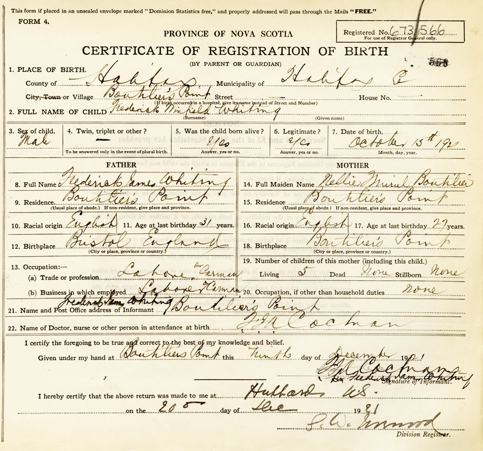 21. Name and Post Office address of Informant Frederick James Whiting Boutiliers Point