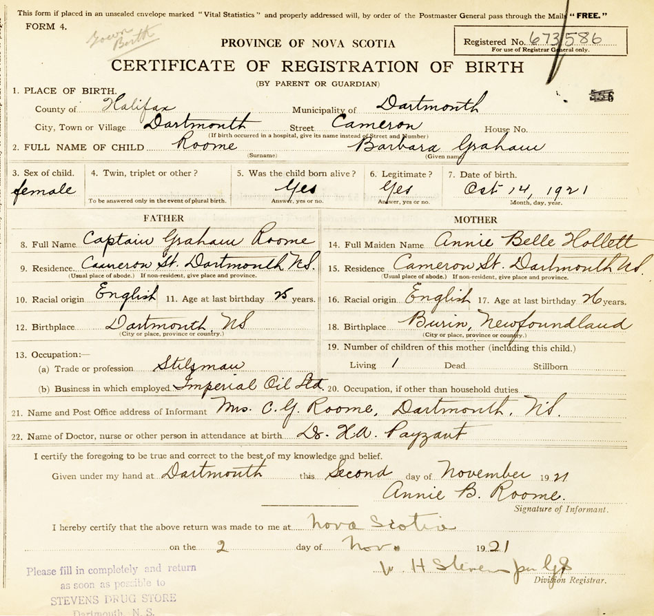 21. Name and Post Office address of Informant Mrs C G Roome, Dartmouth Dartmouth, Ns