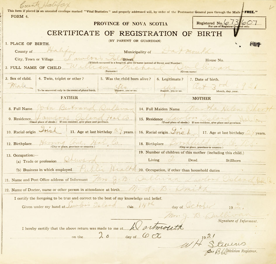 21. Name and Post Office address of Informant Mrs. J. B. Sullivan Lawlers Island, Hal.
