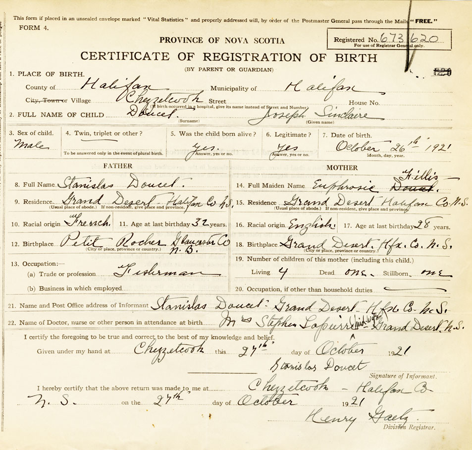 21. Name and Post Office address of Informant Stanislas Doucet Grand Desert, Halifax County