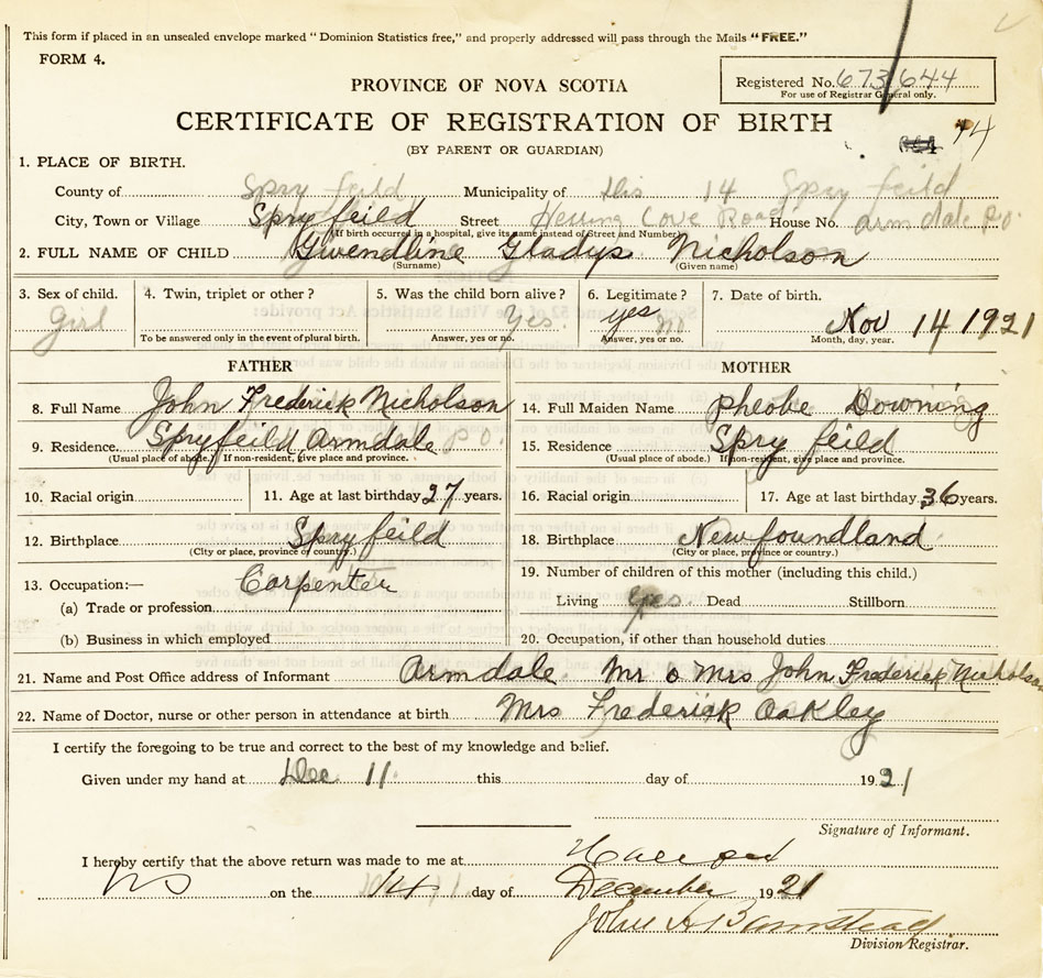 21. Name and Post Office address of Informant Mr. and Mrs. John Frederick Nicholson Armdale Spryfield