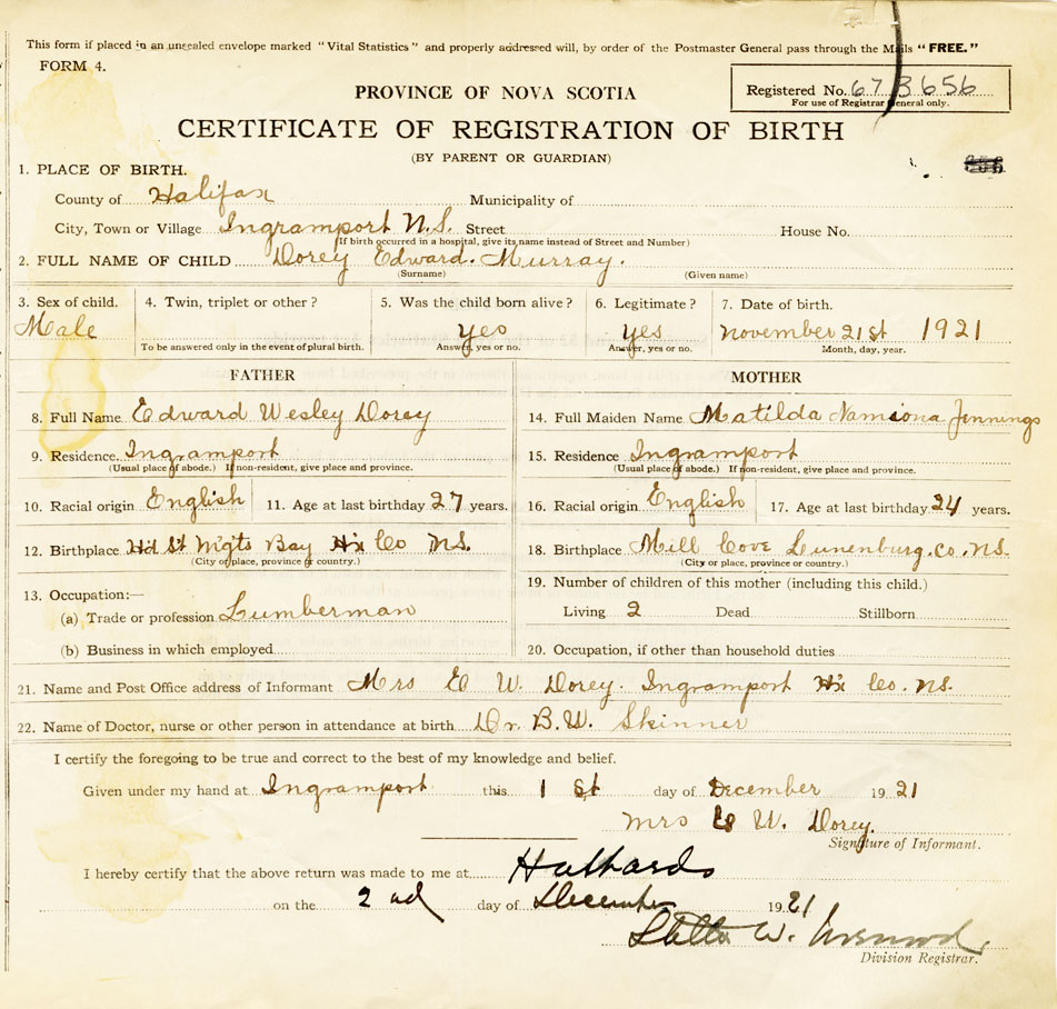 21. Name and Post Office address of Informant Mrs. E. W. Dorey Ingramport, Hfx.
