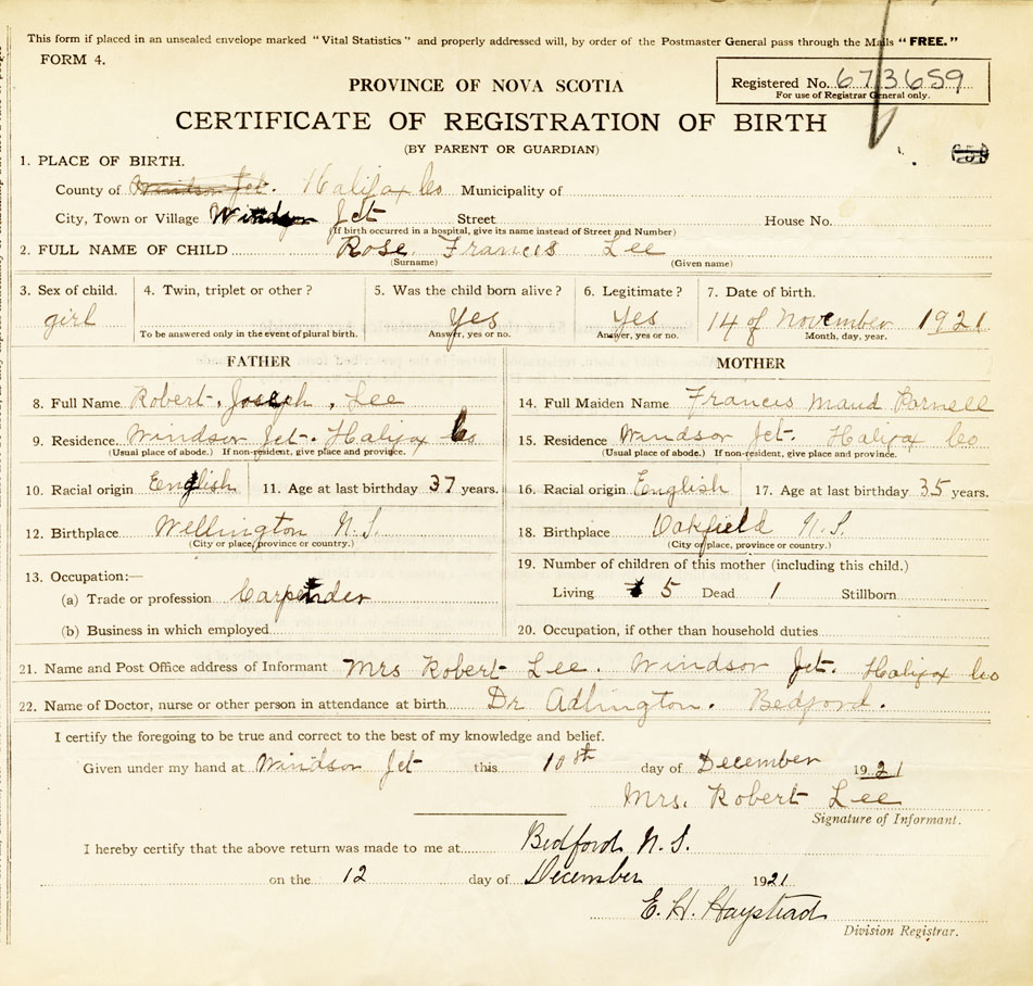 21. Name and Post Office address of Informant Mrs. Robert Lee Windsor Jct., Halifax