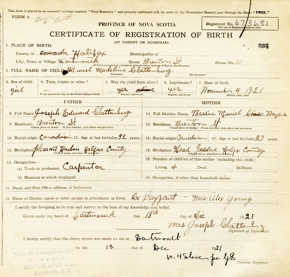 22. Name of Doctor, nurse or other person in attendance at birth Dr. Payzant - Mrs. Alex Young