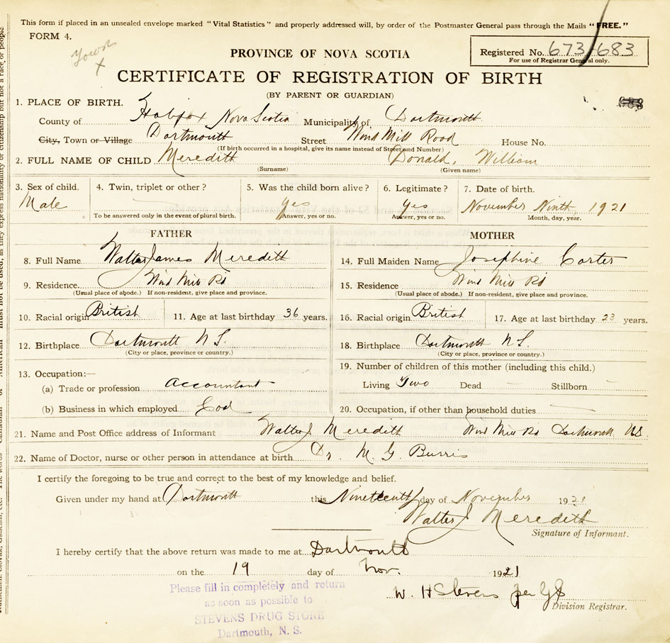 21. Name and Post Office address of Informant Walter J. Meredith Wind Mill Rd Dartmouth N. S.