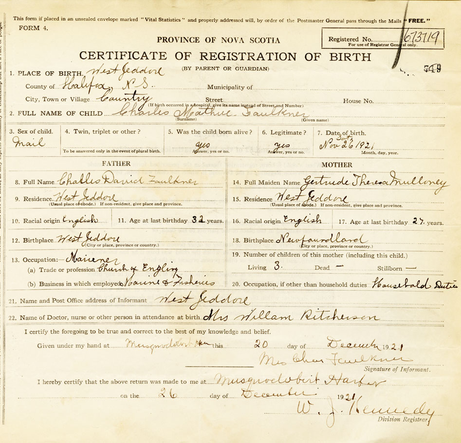 21. Name and Post Office address of Informant Mrs. Chas. Faulkner West Jeddore