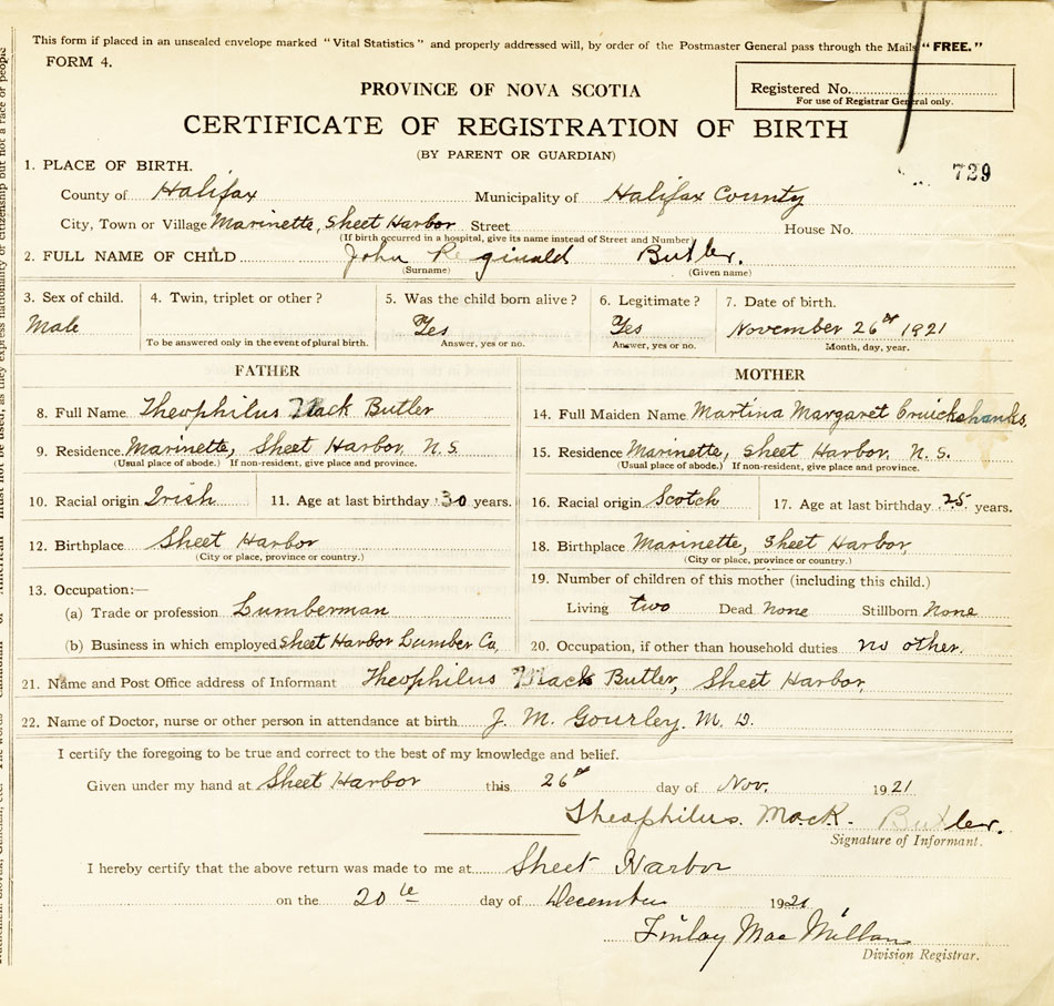 21. Name and Post Office address of Informant Theophilus Mack Butler Sheet Harbor