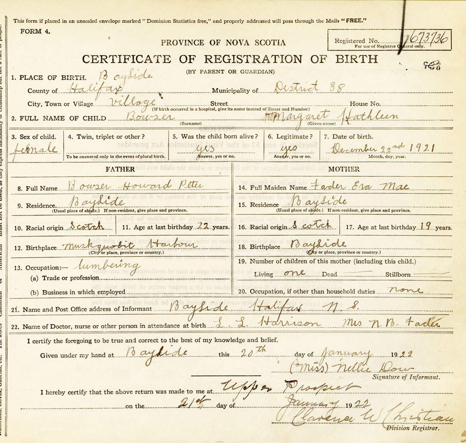 21. Name and Post Office address of Informant Nellie Dow, Bayside, Halifax Nova Scotia Bayside