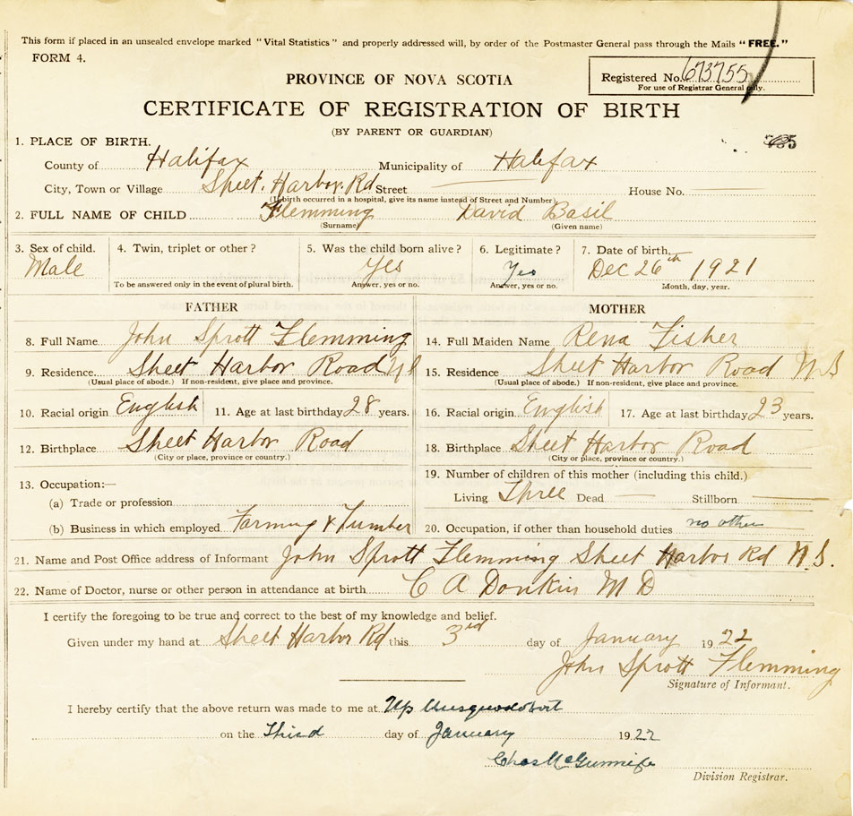 21. Name and Post Office address of Informant John Sprott Flemming Sheet Harbor Road