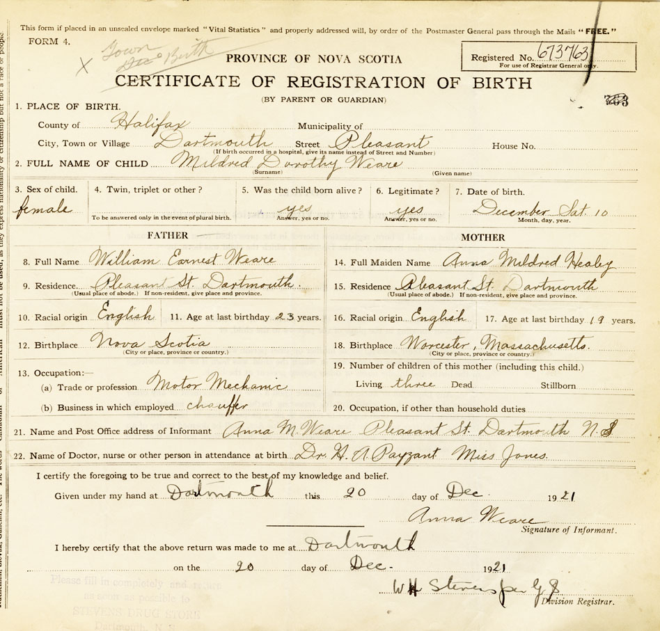 2. FULL NAME OF CHILD Weare, Mildred Dorothy