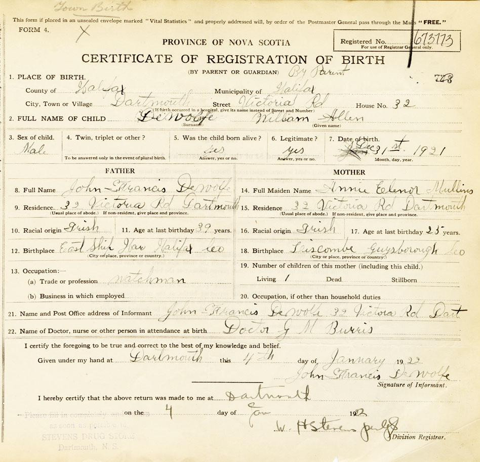 21. Name and Post Office address of Informant John Francis Dewolfe 32 Victoria Rd., Dartmouth